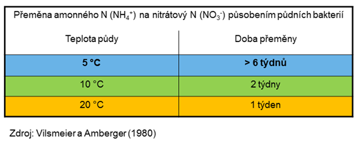 Za chladného počasí trvá následná přeměna amonného dusíku na nitrátový mnohem déle než obvykle. V případě zamokřených půd a souvisejícího nedostatku kyslíku v půdě trvá přeměna amonného dusíku na nitrátový ještě déle.